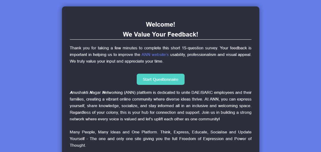 I always think that we need to know the requirement of the members of ANN and update the website accordingly. For that created a simple feedback system contining 15 questions regarding ANN website.